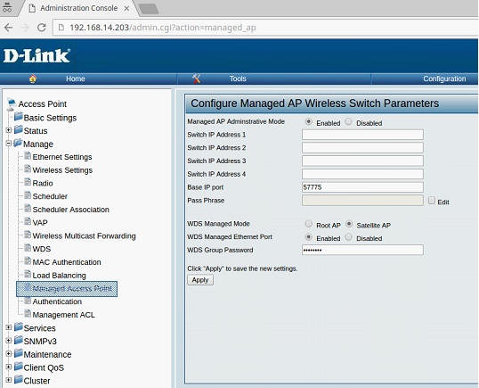 Группа WDS AP состоит из двух типов ТД: Root AP и Satellite AP. Root AP выступает в качестве моста или повторителя беспроводной среды передачи данных и осуществляет связь с контроллером по проводной линии связи. Satellite AP обменивается данными с контроллером через WDS соединение с Root AP. WDS мост может быть защищен с помощью аутентификации WPA2 Personal + AES шифрование. Когда AP находится в управляемом режиме, удаленный доступ к ней отсутствует. Тем не менее, вы можете разрешить доступ через Telnet, включив функцию отладки (режим debug) на странице Managed AP List Settings.