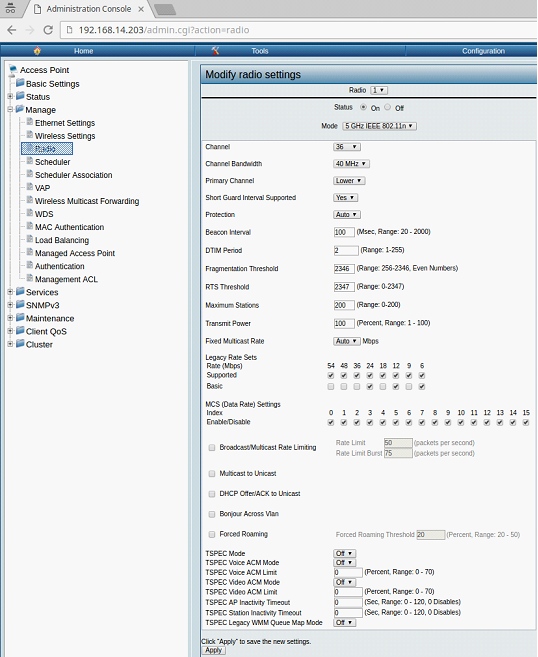 • Необходимо выбрать радиодиапазон, в котором ТД будет подключаться по WDS к корневой точке (Root AP). В данном примере выбрано Radio = 1 — диапазон 5 Ггц и дополнительно задано использование только стандарта IEEE 802.11n;