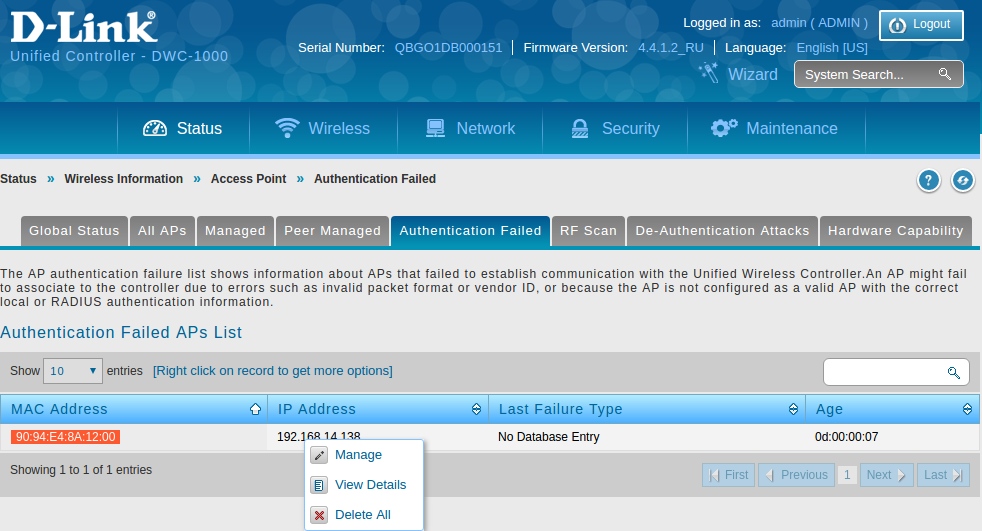 Зайдите на интерфейс контроллера и перейдите в раздел Status> Access Point >Authentication Failed