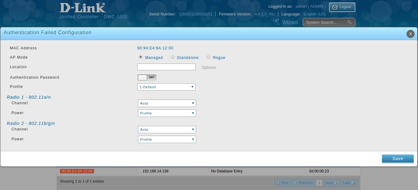 В данном разделе отображаются ТД, которые были обнаружены контроллером. В нашем случае — это «ближняя» (Root AP) DWL-6600AP подключенная по LAN  в сеть. Как видно из скриншота выше, ТД еще не под управлением контроллера и имеет состояние «No Database Entry». Данную точку необходимо перевести в режим Manage.