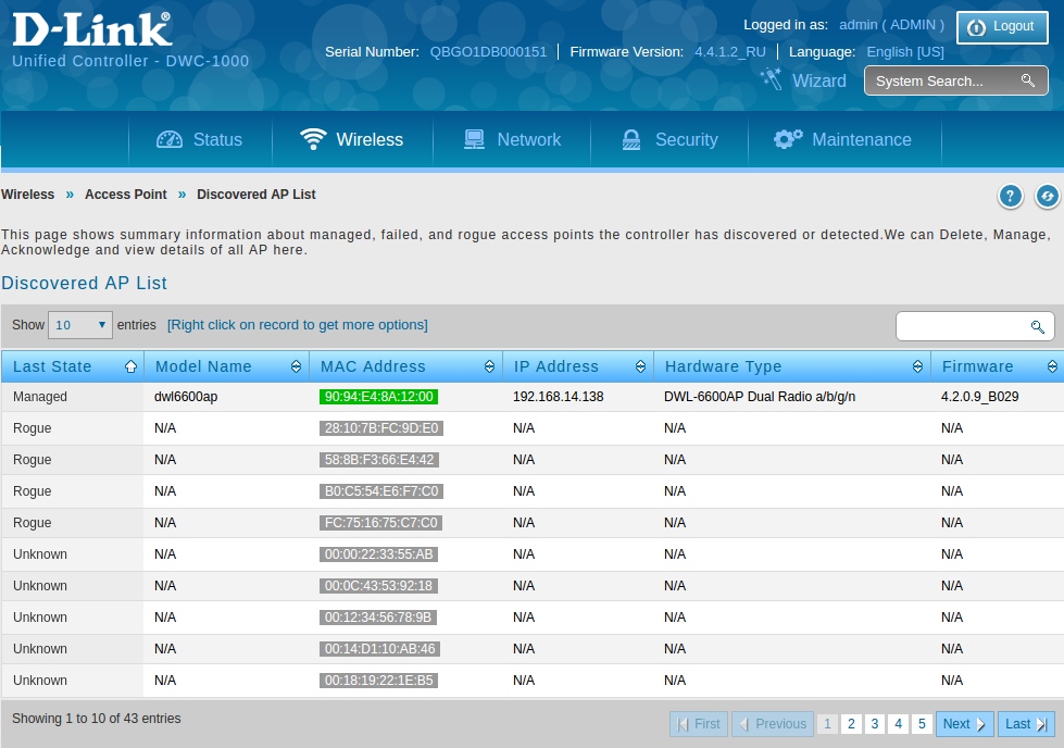 Через несколько минут должны увидеть, что статус «ближней» точки доступа (в нашем примере с MAC-адресом 90:94:E4:8A:12:00) изменился на «Managed». Более того, с помощью данной точки доступа контроллер DWC-1000 просканировал радио-окружение. В частности, ему стало известно о «удаленных» ТД (в нашем примере с MAC-адресами FC:75:16:75:C7:C0 (Satellite AP DWL-6600) и 28:10:7B:FC:9D:E0 (Satellite AP DWL-3600), которые пока имеют статус «Rogue».