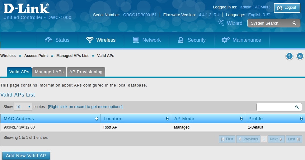 Теперь перейдем на страницу Wirelles > Access Point > Managed Aps List > Valid APs. Откроется окно со списком валидных для контроллера точек доступа.