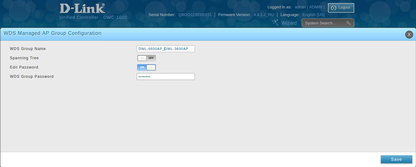 задайте наименование WDS группы в поле «WDS Group Name» (до 32 символов) и установите переключатель в поле «Edit Password» в положение «ON» для возможности ввода пароля в строке «WDS Group Password», который мы задавали ранее при настройке удаленных точек (см. 1 пункт), нажмите «Save».
