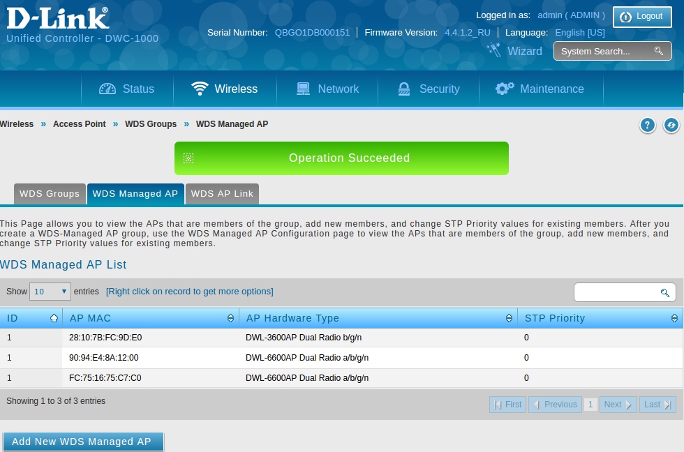 На этом процедура настройки режима WDS на ТД под управлением контроллера DWC-1000 в нашем примере завершено.