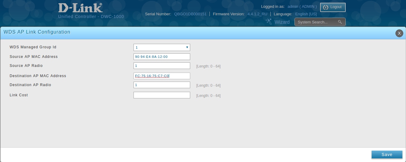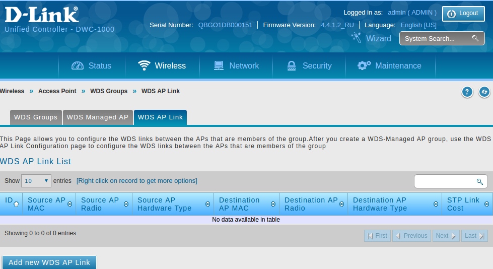 После того, как добавили точки в группу WDS необходимо установить между ними WDS Link, перейдите в Wirelless > Access Point > WDS Groups > WDS AP Link.