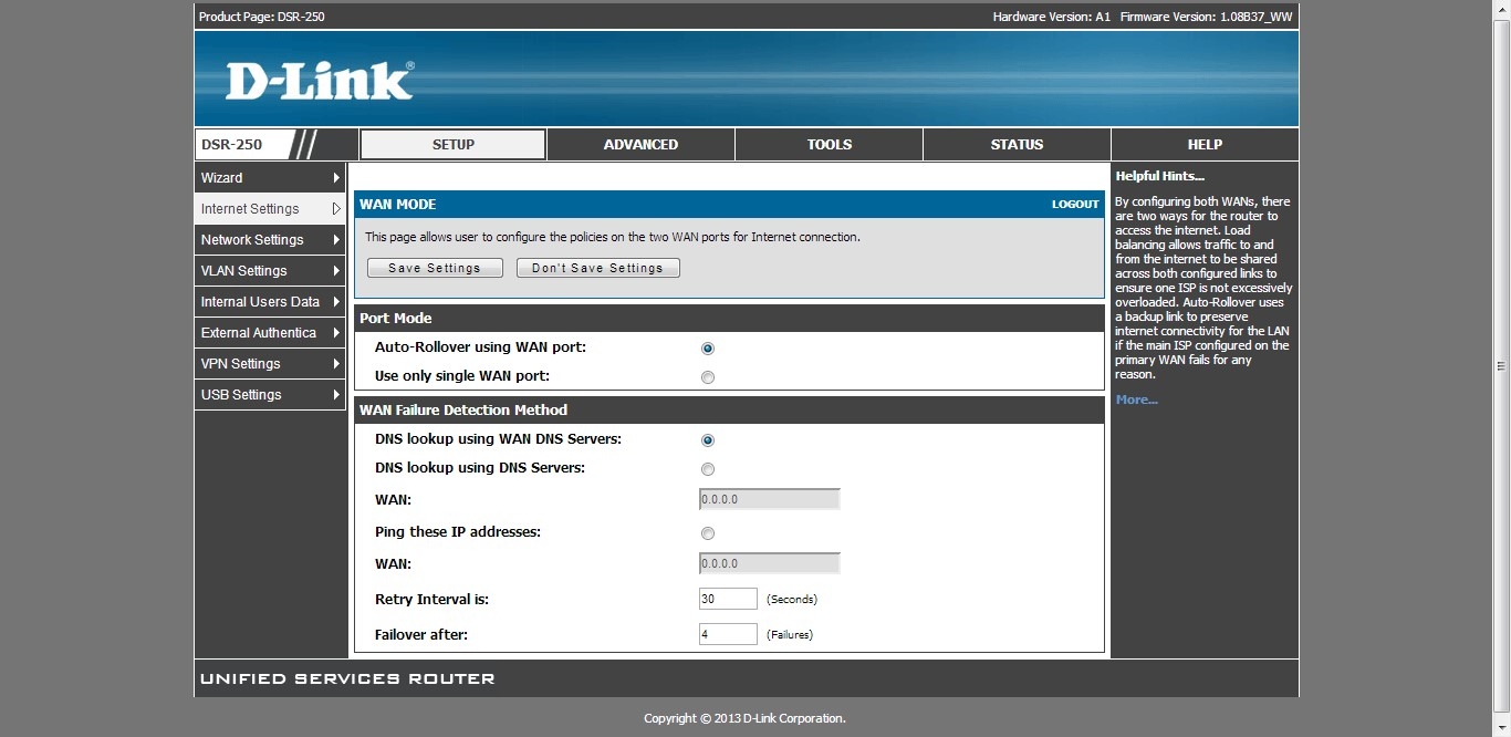 1. Прежде всего следует в разделе SETUP/Internet Settings/WAN Mode переключить режим “Use only single WAN port” на “Auto-Rollover Using WAN port”. Важно не забыть выбрать метод, с помощью которого маршрутизатор должен определить «падение» WAN порту (”WAN Failure Detection Method”). Это может быть ping или nslookup определенных IP-адресов. Также необходимо указать, как часто будет выполняться проверка WAN, и через какое количество проверок соединение будет считаться неактивным и перейдет в статус DOWN. Меньший интервал и меньшее количество попыток обеспечат быстрое переключение с одного канала на другой. Но в тоже время слишком малые значения могут привести к тому, что соединение будет переключаться даже через незначительные потери пакетов, а не тогда, когда действительно нужно.
