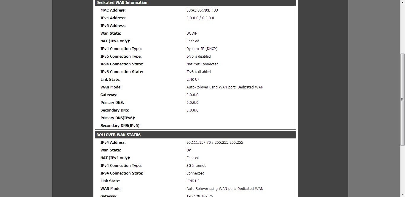 В обычном режиме работы оба WAN находятся в состоянии LINK UP. При этом основное WAN соединение имеет статус UP, а резервное - DOWN. То есть физически доступны оба канала, но сейчас доступ в Интернет обеспечивается через Ethernet соединение.