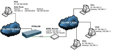Задача. Схема сети представлена на рис.3. Необходимо для компьютера PC4 разрешить доступ к компьютеру PC2. На PC4 для этого заведомо прописан статический маршрут в подсеть 192.168.1.0/24 через шлюз 192.168.100.254.