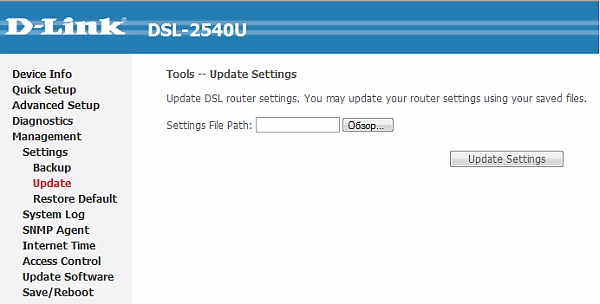 8. В появившемся окне нажмите кнопку «Обзор…» и укажите путь к файлу default.cfg, нажмите Update Settings.