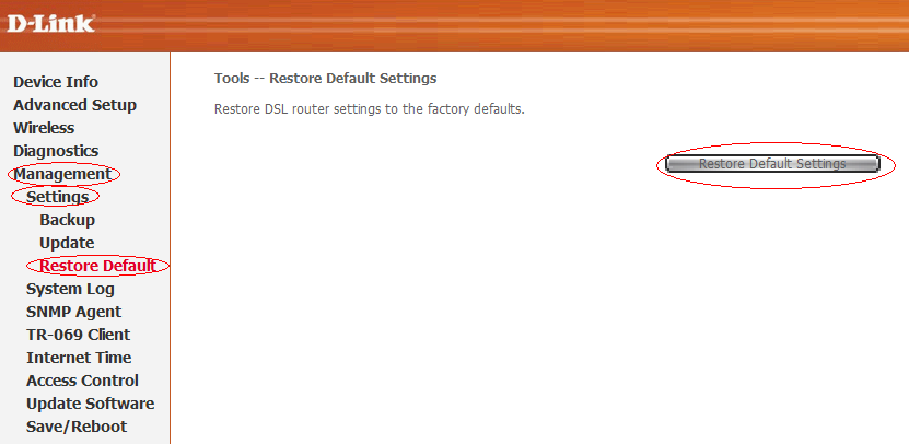 8. После завершения процесса установки ПО, сбросьте настройки модема на заводские, для этого зайдите в Management – Settings – Restore Defaults и нажмите кнопку «Restore Defaults Settings».