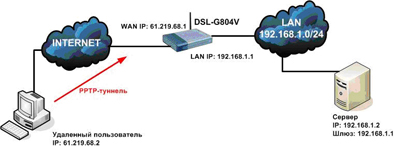 Необходимо обеспечить подключение удаленного пользователя к ресурсам локальной сети. Например, к файловому серверу или серверу баз данных, к общим папкам ПК локальной сети, расположенным за шлюзом DSL-G804V. Для решения этой задачи можно настроить на шлюзе PPTP-сервер.