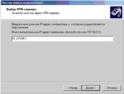- Укажите имя или IP-адрес VPN-сервера и нажмите “Далее”.