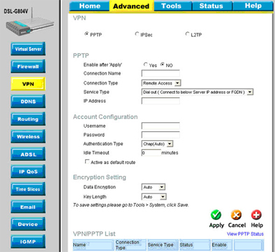 VPN-сервер DSL-G804V позволяет устанавливать PPTP-соединения с использованием как PAP, так и CHAP аутентификации.