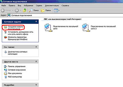 - В свойствах Сетевых подключений выберите "Создание нового подключения" для того, чтобы создать исходящее подключение VPN-PPTP.