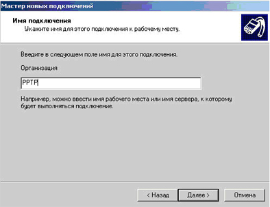 - Укажите имя подключения (например, PPTP) и нажмите “Далее”.