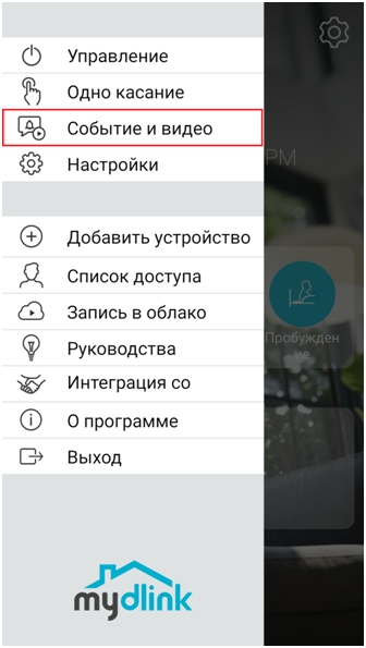 2. После авторизации в учетной записи mydlink откроется главная страница приложения. Нажмите кнопку меню в левом верхнем углу страницы и выберите пункт Событие и видео.