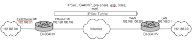 В качестве примера настройки IPSec соединения между двумя DI-804HV рассмотрим такую схему: