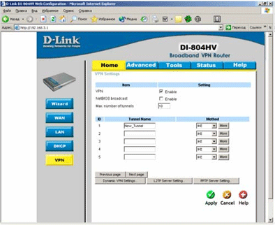 В поле Local Subnet и Local Netmask задать соответствующие параметры для LAN в которой находится DI-804HV