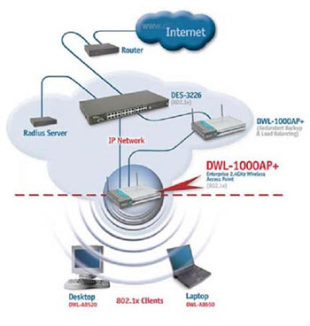 Для обеспечения беспроводным пользователям доступа к корпоративным базам данных или разделяемым ресурсам - серверам и принтерам, вы можете установить точку доступа. Это устройство позволяет взаимодействовать беспроводным рабочим станциям с уже существующей сетью Ethernet. Точки доступа компании D-Link совместимы с протоколом Wi-Fi и прозрачно интегрируются с вашей сетью Ethernet.