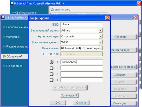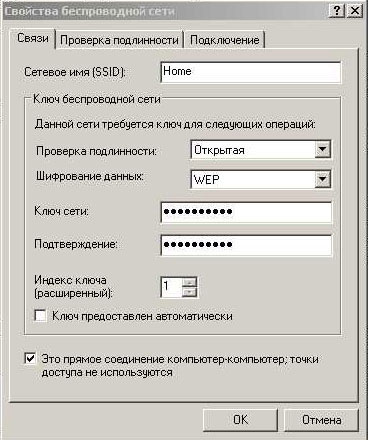 Во избежание несанкционированного подключения к Вашей сети посторонних пользователей необходимо настроить ключ беспроводной сети. Для этого снимите галочку с пункта Ключ предоставлен автоматически. В поле Проверка подлинности выберите тип проверки, например, Открытая. В строке Шифрование данных выберите тип шифрования, поддерживаемый всеми беспроводными адаптерами Вашей сети, например, WEP. В поле Ключ сети введите придуманный Вами ключ доступа к сети. Рекомендуется использовать десятизачный ключ, состоящий из цифр и/или латинских букв от A до F. В поле Подтверждение введите ключ еще раз. Значение Индекс ключа оставьте по умолчанию (1) и поставьте галочку возле пункта Это прямое соединение компьютер-компьютер, точки доступа не используются. Нажмите «Ок».