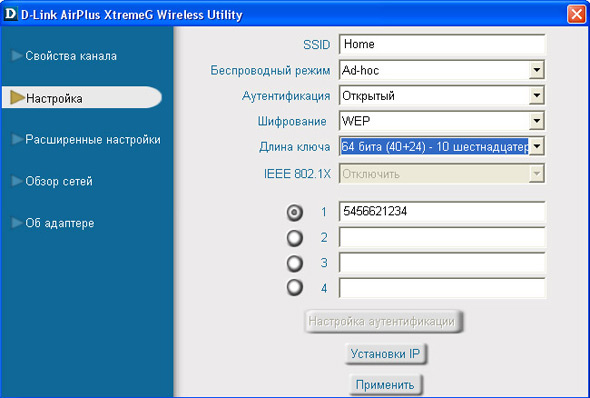 В поле Шифрование выберите тип шифрования, поддерживаемый всеми беспроводными адаптерами Вашей сети, например, WEP. В поле Длина ключа выберите желаемую длину ключа (в примере – 64 бита, т.е. 10 шестнадцатеричных символов). В поле 1 введите придуманный Вами ключ доступа к сети, состоящий из цифр и/или латинских букв от A до F. Нажмите Применить.