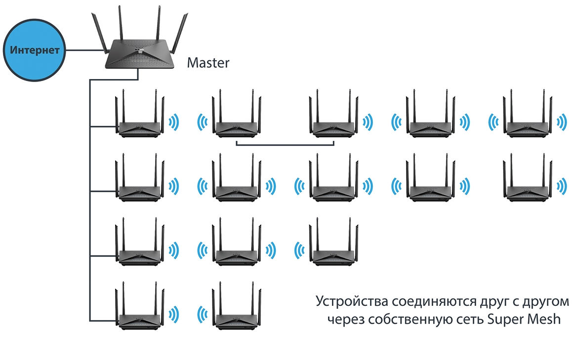 Функция автонастройки Super Mesh будет полезна, если вам необходимо быстро развернуть сеть с единым DHCP-сервером на базе нескольких маршрутизаторов D-Link. Все устройства соединяются друг с другом через собственную сеть Super Mesh по кабелю или беспроводным способом. Чтобы упростить настройку, основной маршрутизатор (Master) автоматически передает зависимым устройствам (Slave) настройки Super Mesh, не требуя вручную прописывать эти параметры на каждом из них. Максимальное количество устройств в сети Super Mesh – 16.