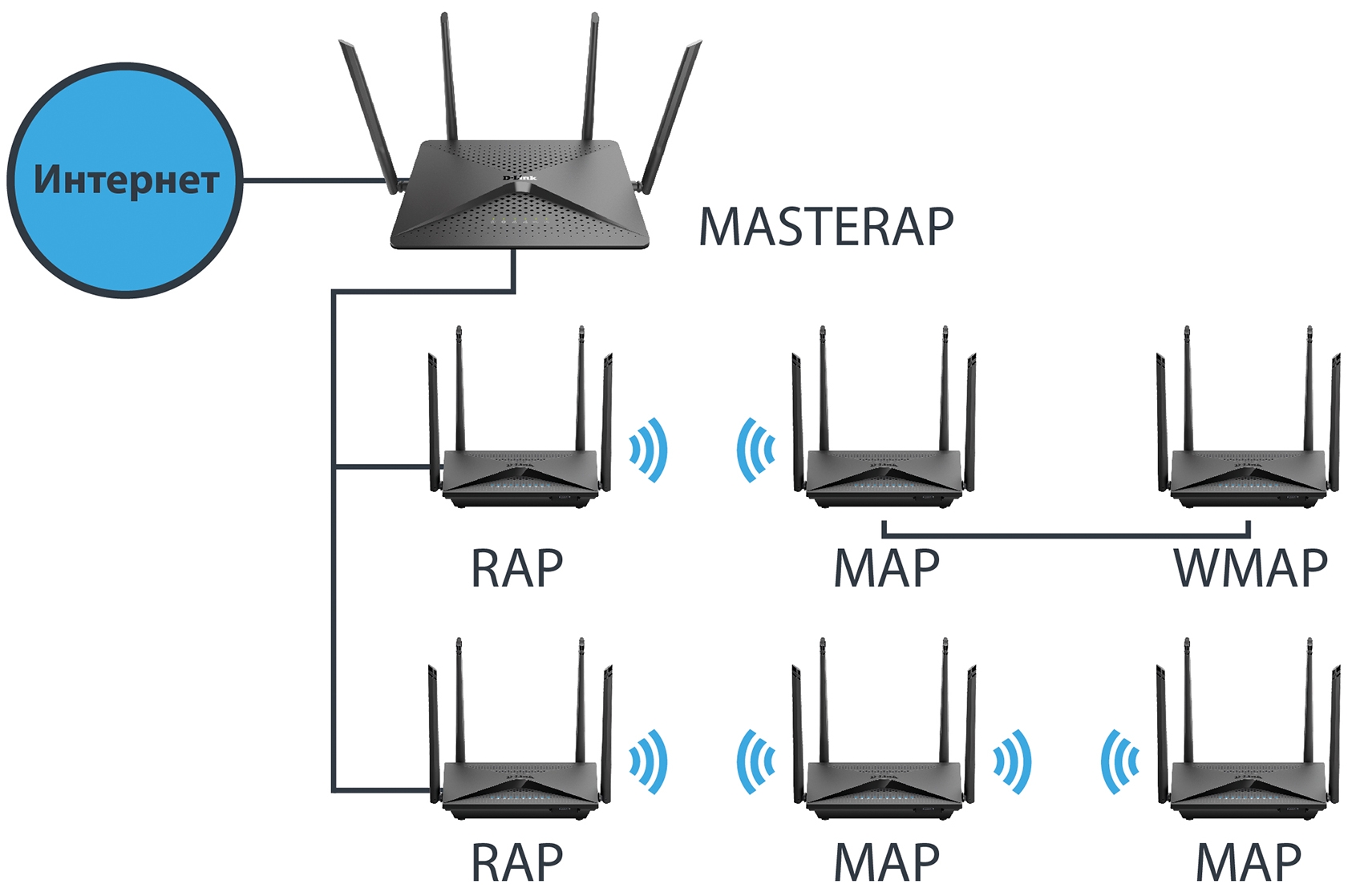 MASTERAP – главный маршрутизатор, который получает Интернет от провайдера или из вышестоящей сети.