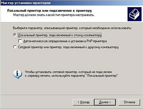 5. Поставьте переключатель на «Локальный принтер, подключенный к этому компьютеру» и снимите галочку «Автоматическое определение и установка PnP-принтера», нажмите Далее