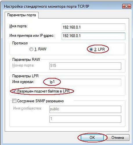 8. В поле Протокол выберите протокол LPR. В поле Имя очереди введите lp1 (Первая буква – это маленькая L, а не большая i), поставьте галочку Разрешен подсчет байтов в LPR. Нажмите ОК, затем Закрыть.