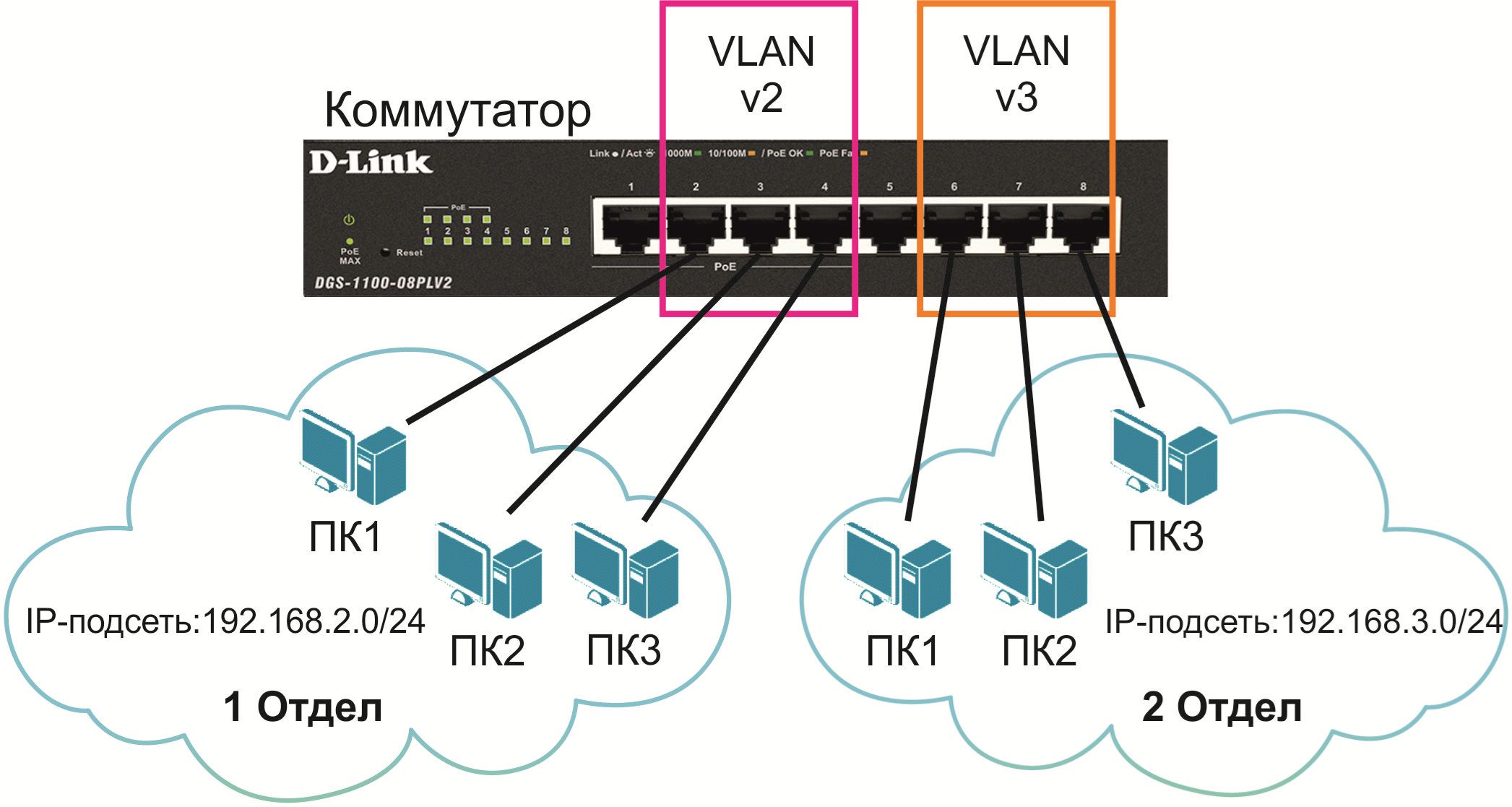 - Применяется в пределах одного коммутатора. Если необходимо организовать несколько рабочих групп небольшой сети на основе одного коммутатора, например, разделить технический отдел и отдел продаж, то VLAN на базе портов оптимально подходит для данной задачи.