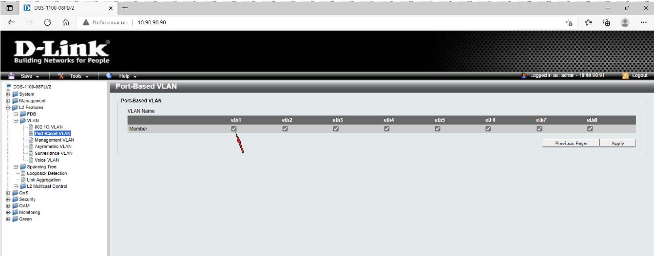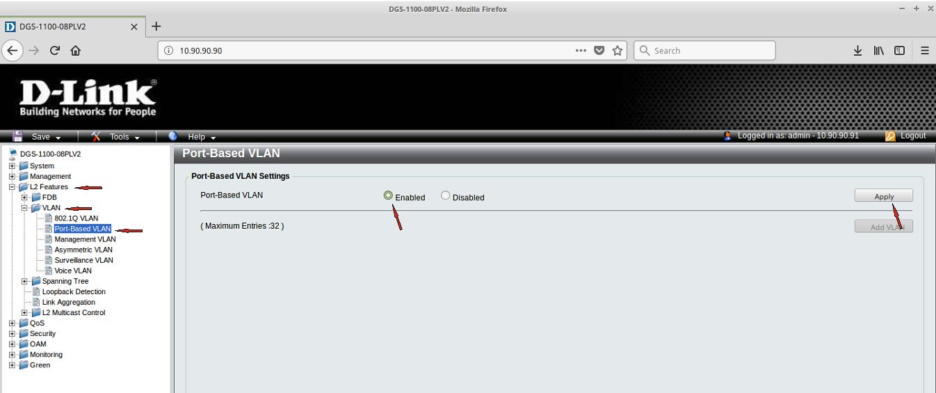 3. Далее активируйте функцию Port-Based VLAN. Для этого в меню слева выберите L2 Features –> VLAN –> Port-Based VLAN, в правой части выберите Enable и нажмите Apply.