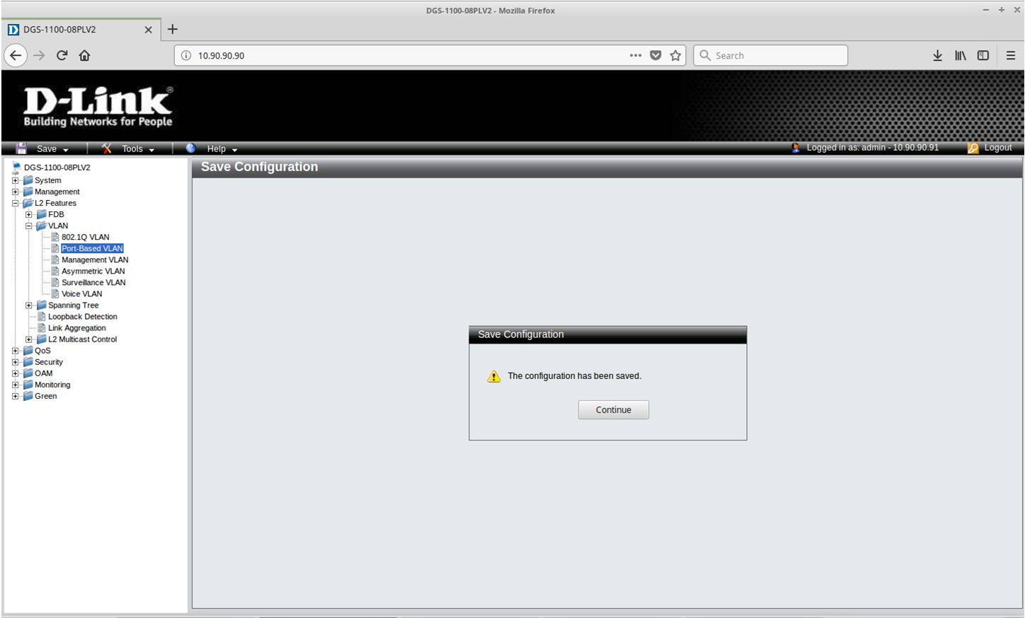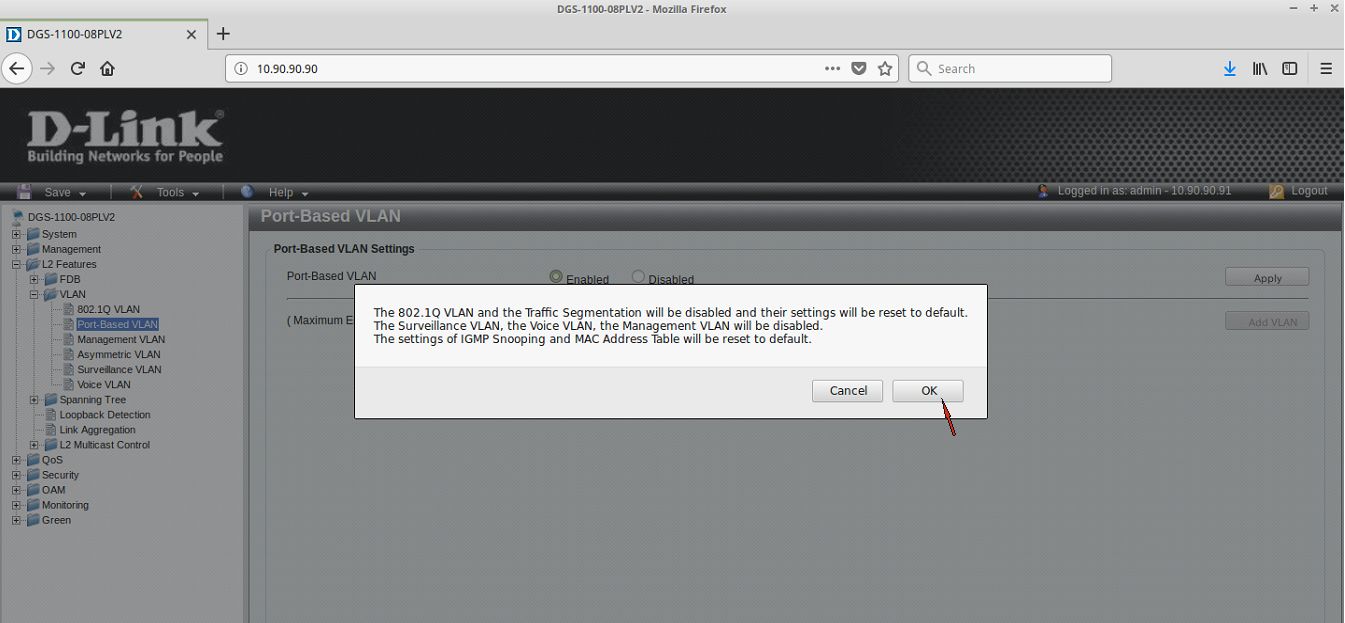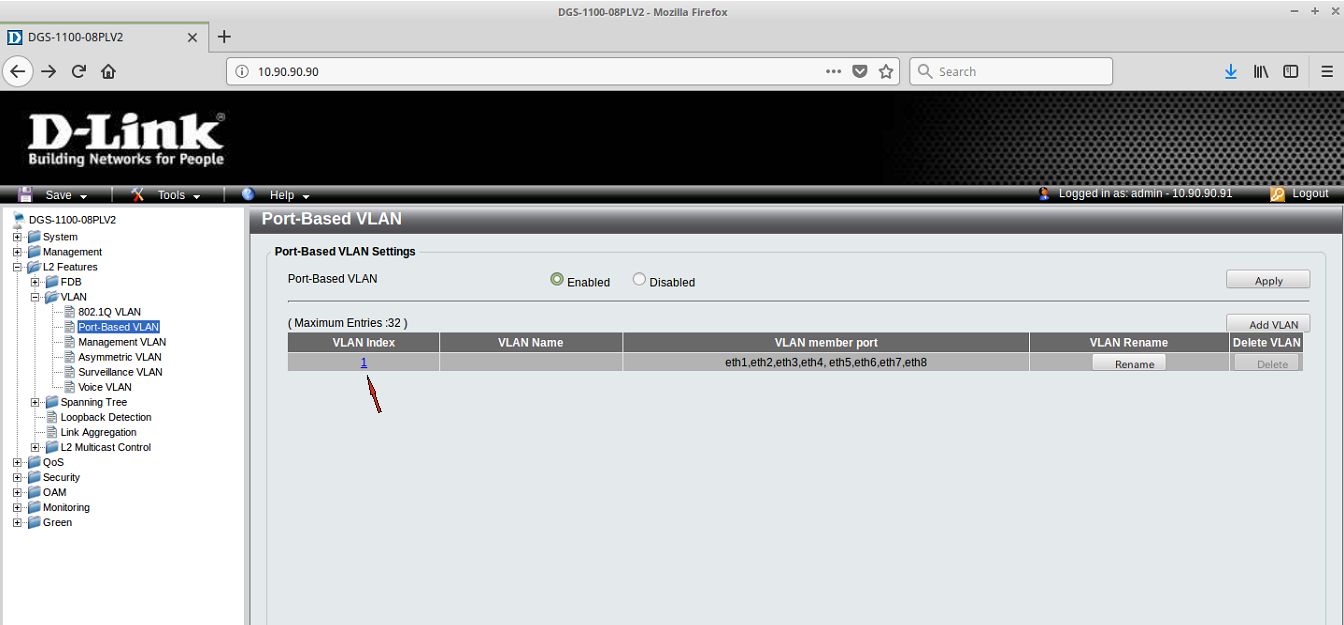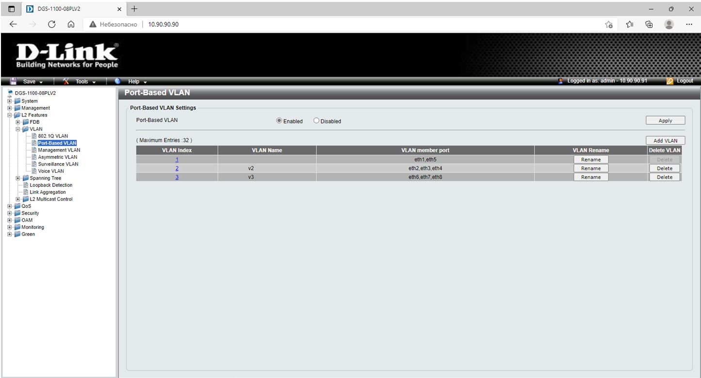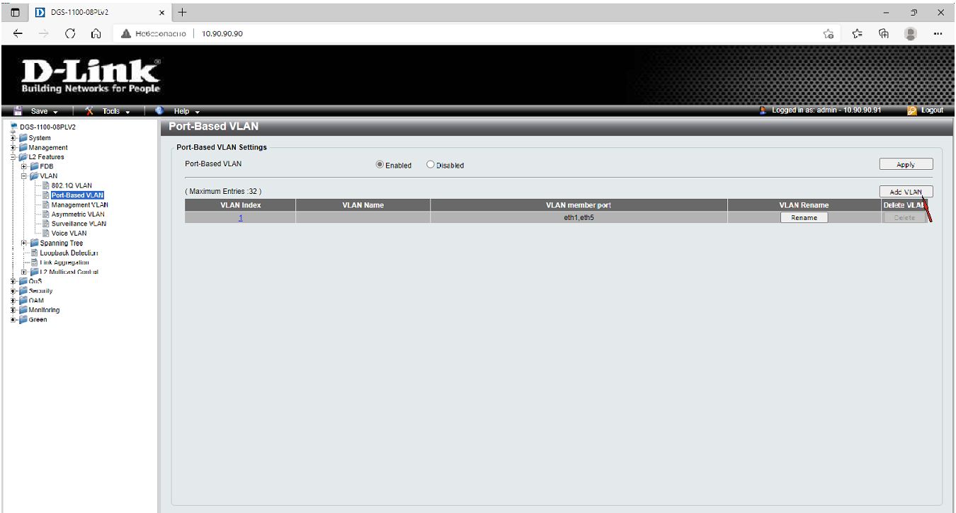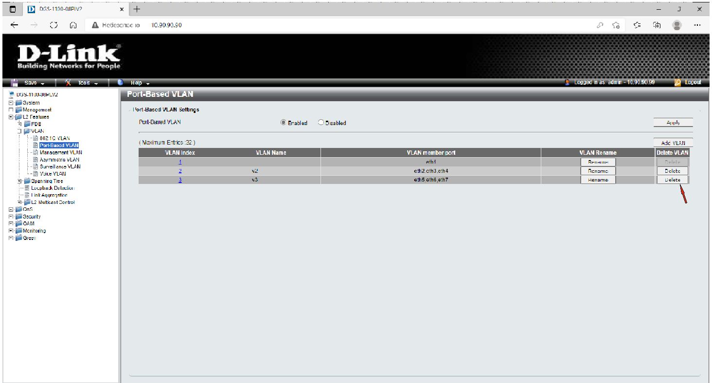 11. Чтобы удалить VLAN, перейдите на страницу L2 Features –> VLAN –> Port-Based VLAN и нажмите Delete в строке VLAN, которую необходимо удалить.
