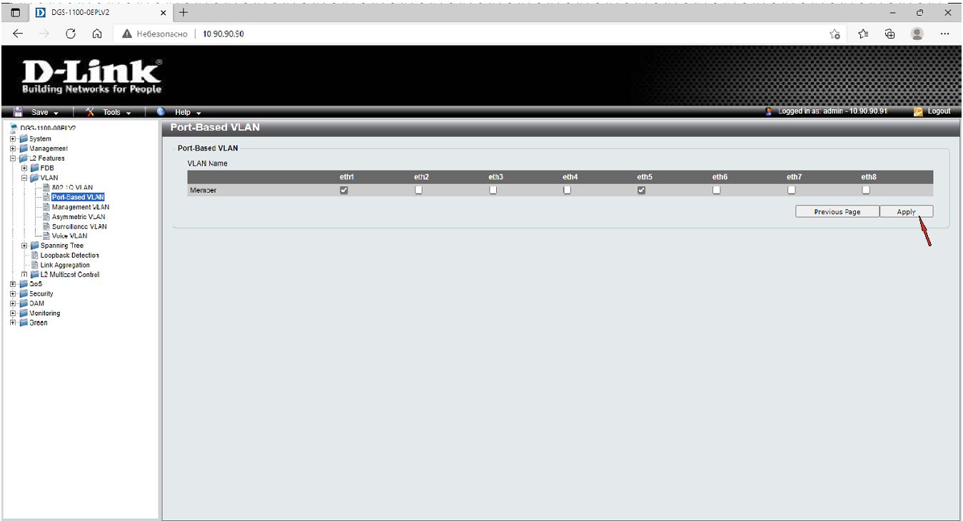 Снимите флажок с тех портов, которые необходимо удалить из VLAN 1 и добавить в новые VLAN. Нажмите Apply.