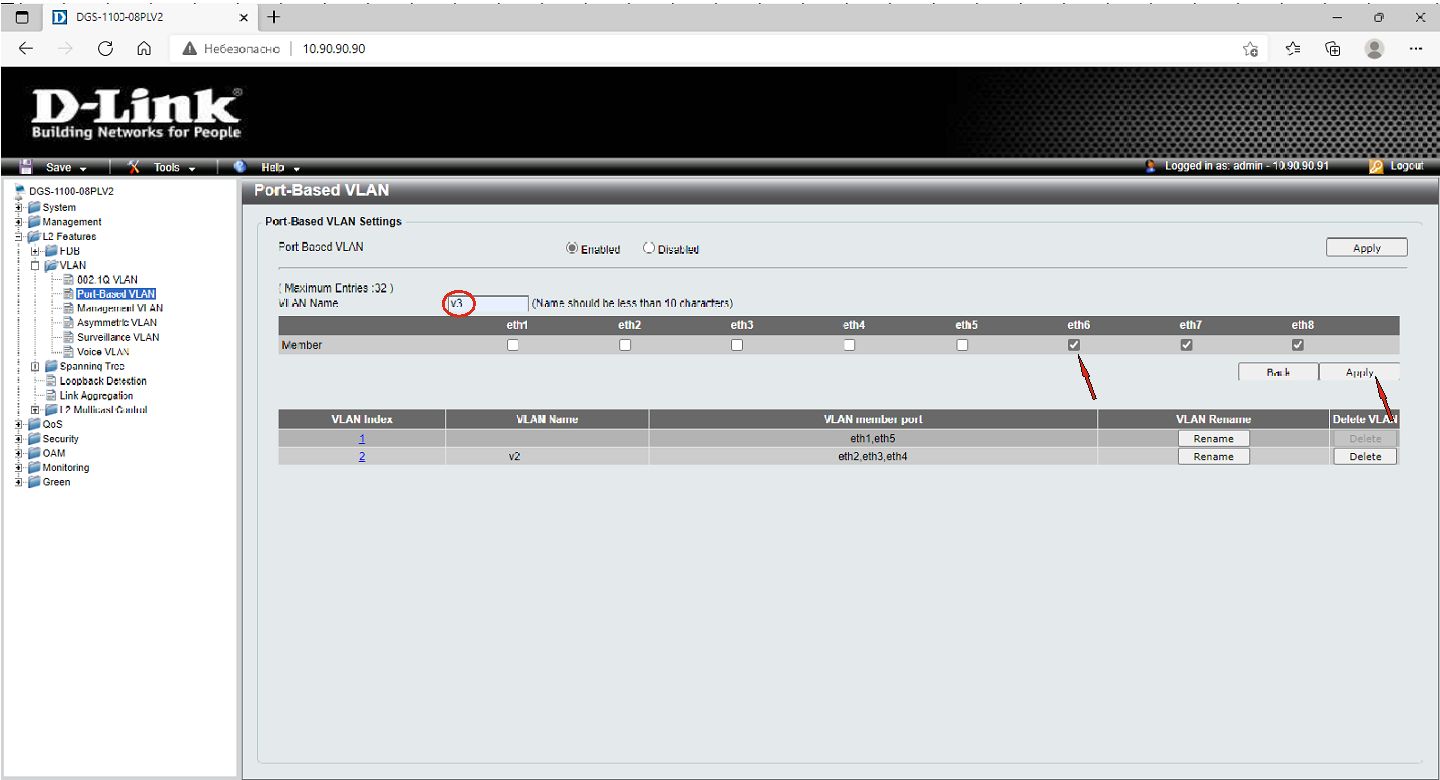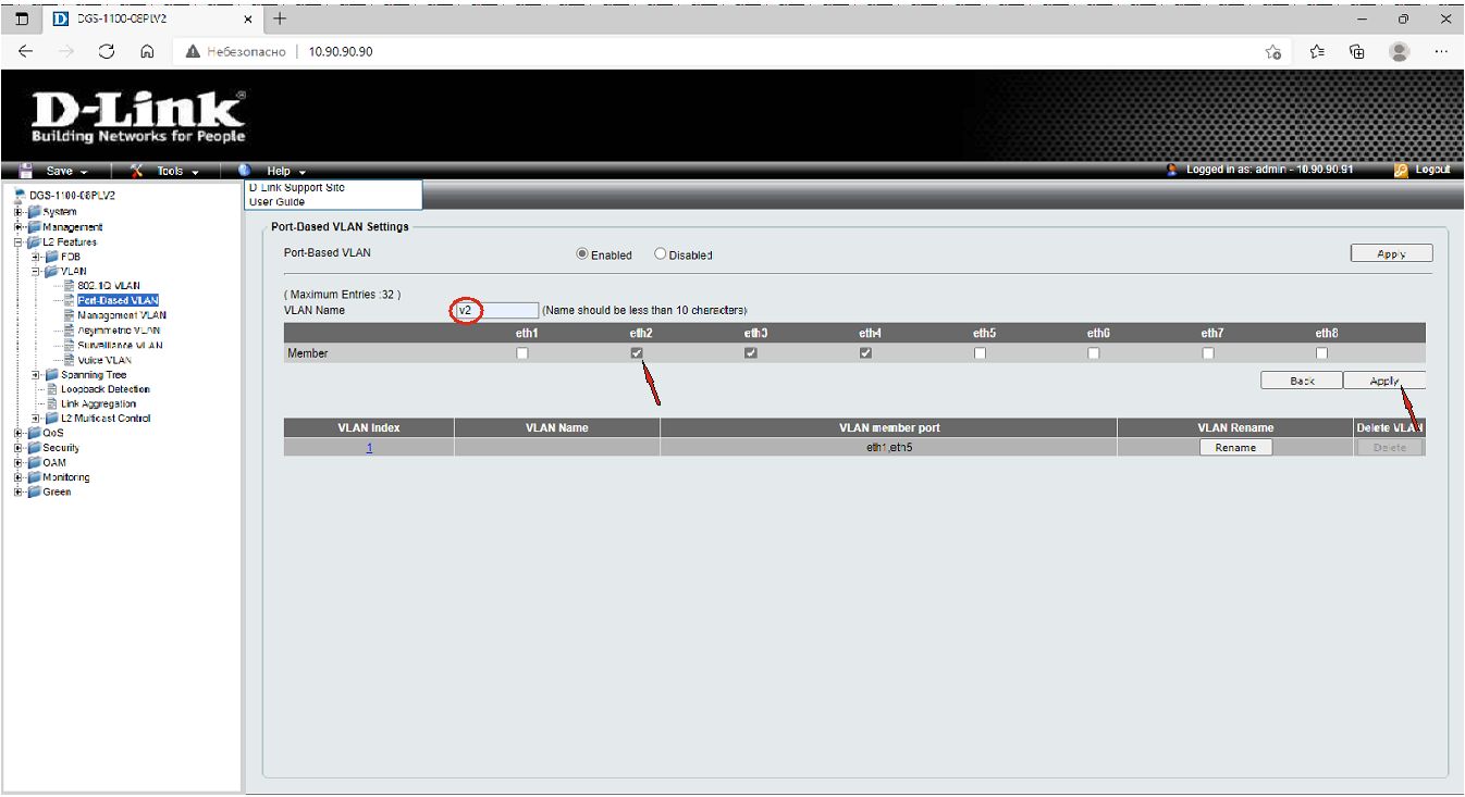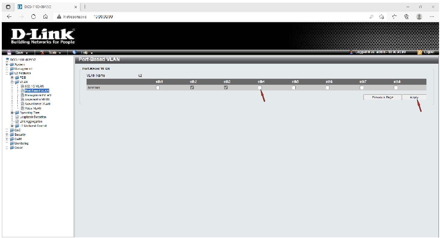 В поле VLAN Name задайте имя сети v2 и закрепите за ней необходимые порты, установив флажки в соответствующих полях. Нажмите кнопку Apply.