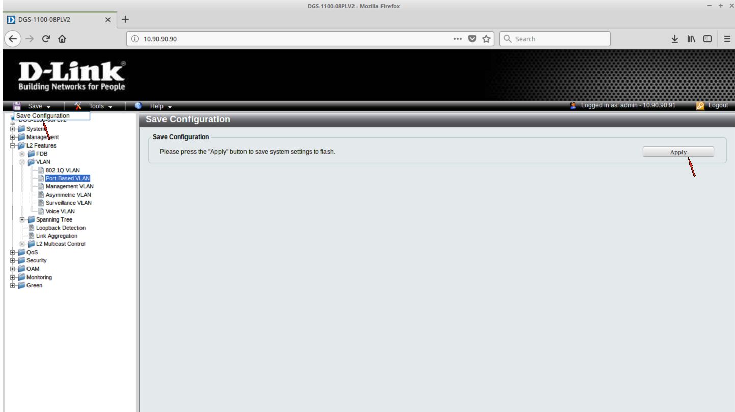 6. Сохраните настройки коммутатора, нажав в левом верхнем углу Save –> Save Configuration, а в рабочей области справа – Apply.