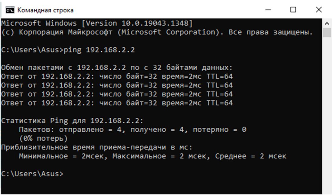 8. Проверьте работу сети с помощью команды ping. С любой рабочей станции подсети 192.168.2.0/24 (VLAN v2) проверьте доступность другой рабочей станции из этой подсети. При правильной настройке Port-Based VLAN пакеты должны передаваться.