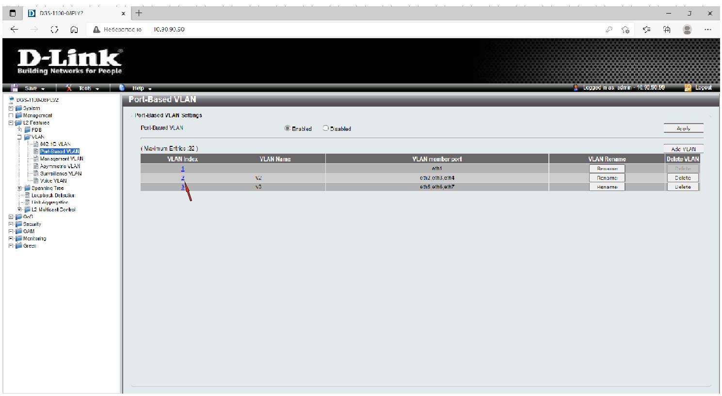 4. При использовании Port-Based VLAN порт коммутатора может быть членом только одной VLAN. Первоначально все порты являются членами VLAN по умолчанию (VLAN 1). Удалите из VLAN 1 порты, которые будут включены в VLAN v2 и VLAN v3. Для этого в столбце VLAN Index таблицы нажмите 1.