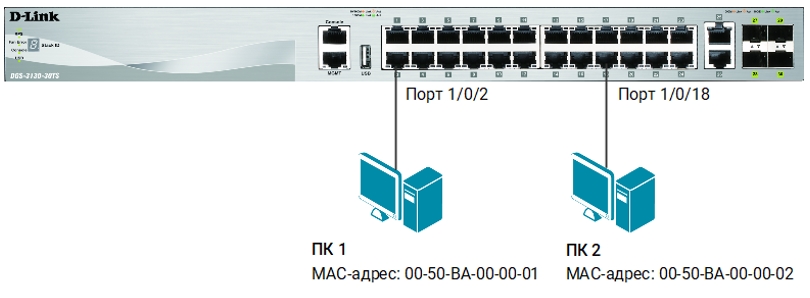Для ПК 1 и ПК 2 создаются статические записи в таблице МАС-адресов коммутатора. Динамическое изучение коммутатором МАС-адресов отключается для портов 1/0/1-24. При подключении к коммутатору новых рабочих станций в будущем, в таблице коммутации потребуется создать статические записи для них.