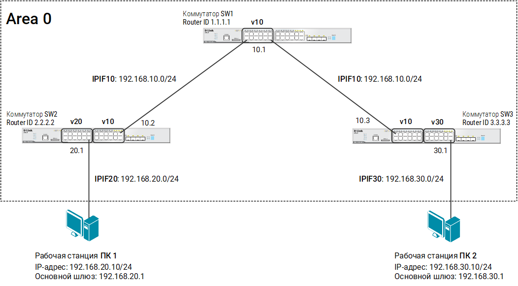 По умолчанию OSPF-интерфейсы коммутаторов L3 D-Link поддерживают широковещательный тип сети (Broadcast). При желании администратор может изменить тип сети на интерфейсе на Point-to-Point с помощью специальной команды.