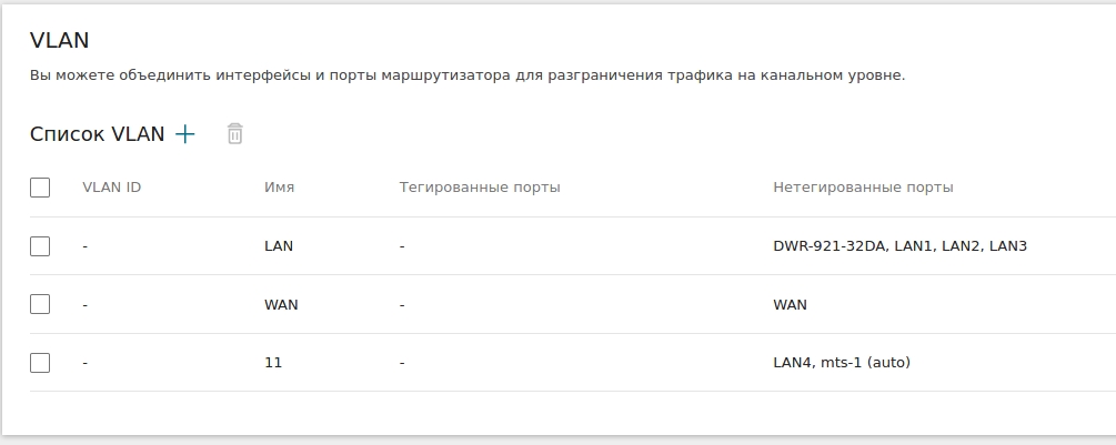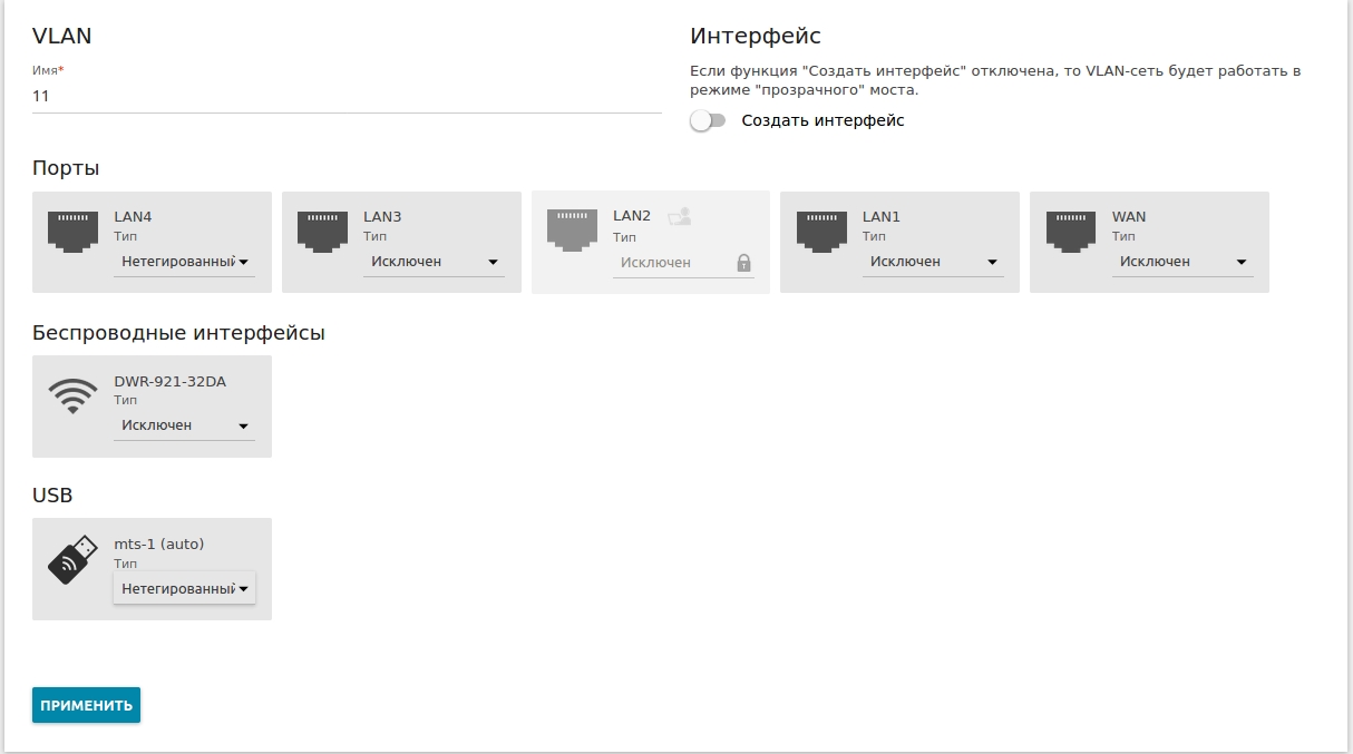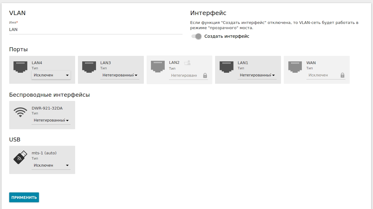 В открывшемся окне в новую сеть добавьте порт LAN4 и USB-интерфейс (в примере это mts-1 (auto)), выбрав в обоих случаях Нетегированный. Затем нажмите кнопку Применить.