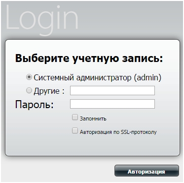 Шаг 2: Именем пользователя для учетной записи администратора является “admin”. Введите пароль администратора в соответствующем поле. Если пароль по умолчанию не был изменен, оставьте это поле пустым. Нажмите Авторизация.