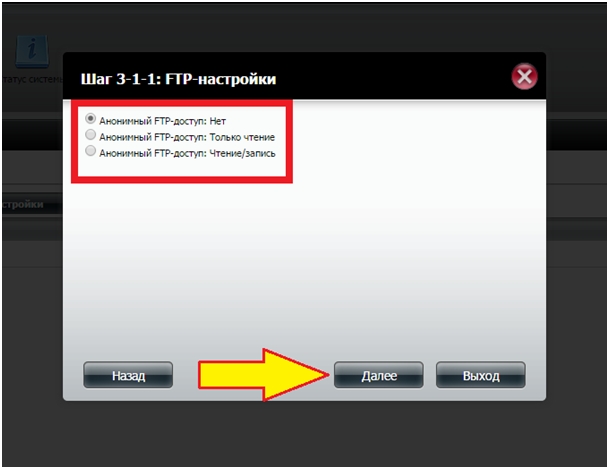 Шаг 14: Выберите правило доступа для Анонимного пользователя при подключении по протоколу FTP и затем нажмите кнопку Далее.