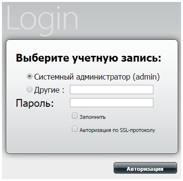 Шаг 2: Именем пользователя для учетной записи администратора является “admin”. Введите пароль администратора в соответствующем поле. Если пароль по умолчанию не был изменен, оставьте это поле пустым. Нажмите Авторизация.