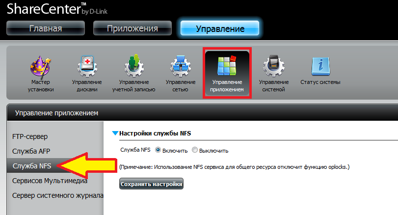Шаг 4: Выберите Управление приложением, далее в меню слева выберите Служба NFS.