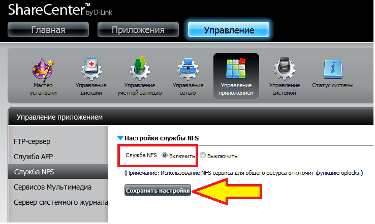 Шаг 5: В разделе Настройки службы NFS выберите Включить и нажмите Сохранить настройки.