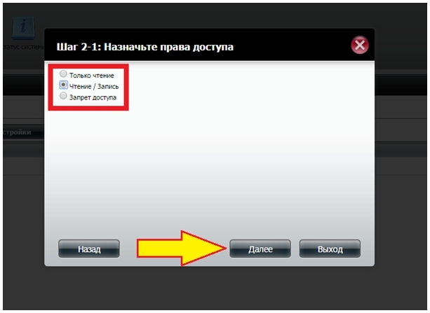 Шаг 15: Настройте опции сетевого доступа для этой папки по протоколу NFS и затем нажмите кнопку Далее.