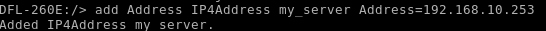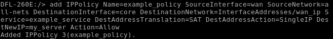 add IPPolicy Name=example_policy SourceInterface=wan SourceNetwork=all-nets DestinationInterface=core DestinationNetwork=InterfaceAddresses/wan_ip Service=example_service DestAddressTranslation=SAT DestAddressAction=SingleIP DestNewIP=my_server Action=Allow