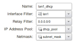 add DHCPServer lan1_dhcp Interface=lan1 IPAddressPool=dhcp_pool DNS1=dns_srv DefaultGateway=InterfaceAddresses/lan1_ip Netmask=subnet_mask