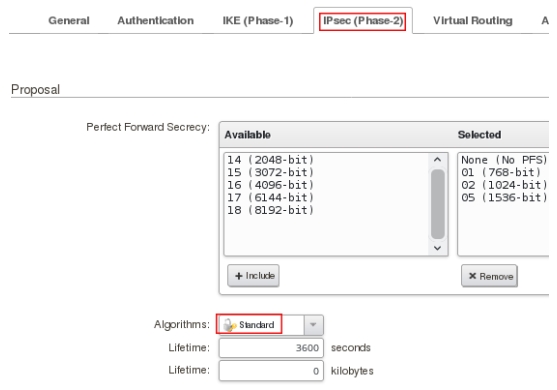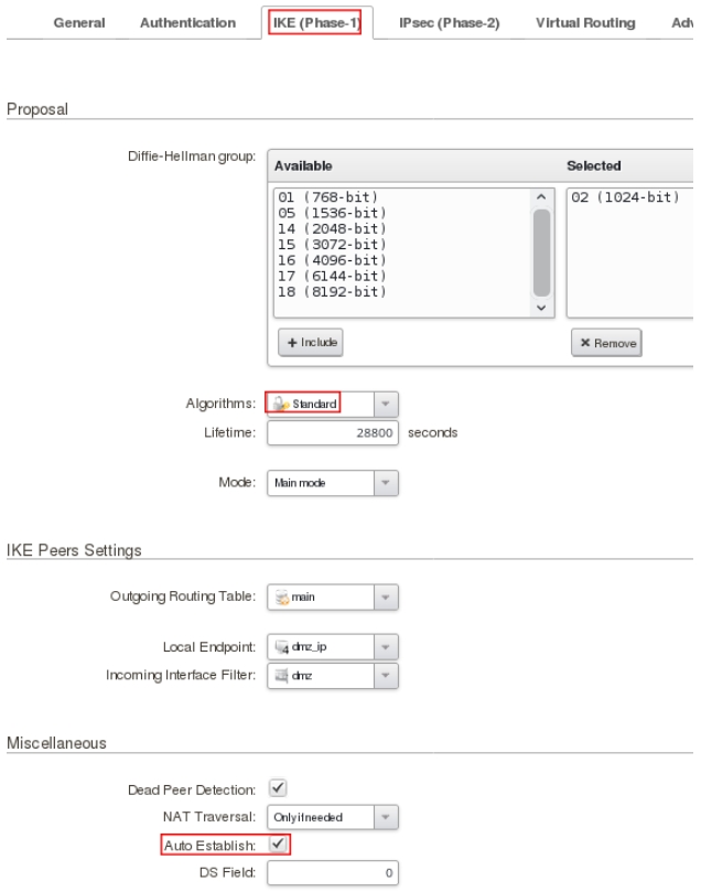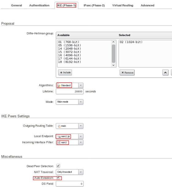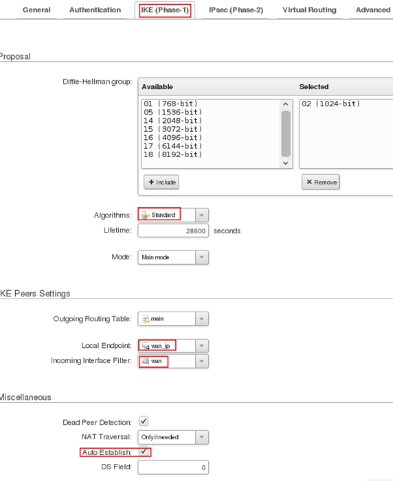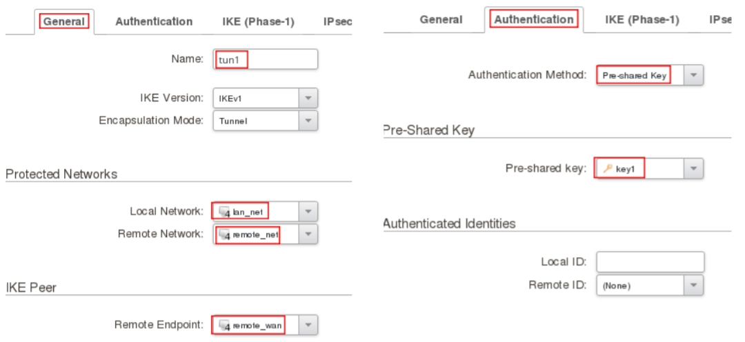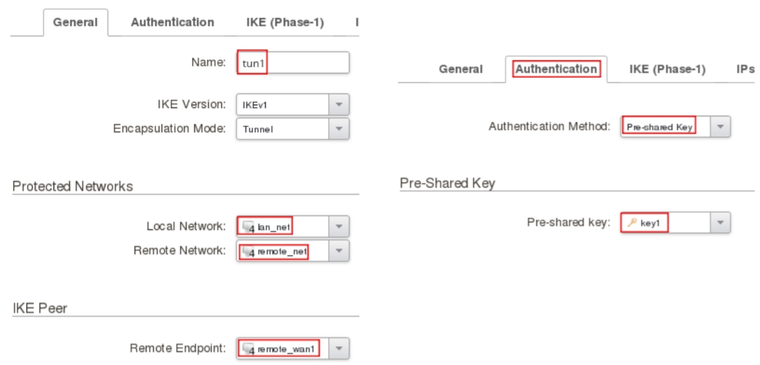 add Interface IPsecTunnel tun1 PSK=key1 LocalNetwork=InterfaceAddresses/lan_net RemoteNetwork=remote_net IPsecAlgorithms=Standard IKEAlgorithms=Standard RemoteEndpoint=remote_wan AutoEstablish=Yes AddRouteToRemoteNet=No LocalEndpoint=InterfaceAddresses/wan1_ip IncomingInterfaceFilter=wan1 AutoInterfaceNetworkRoute=No