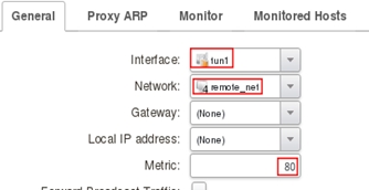 add Route Interface=tun1 Network=remote_net Metric=80 RouteMonitor=Yes EnableHostMonitoring=Yes Reachability=ALL